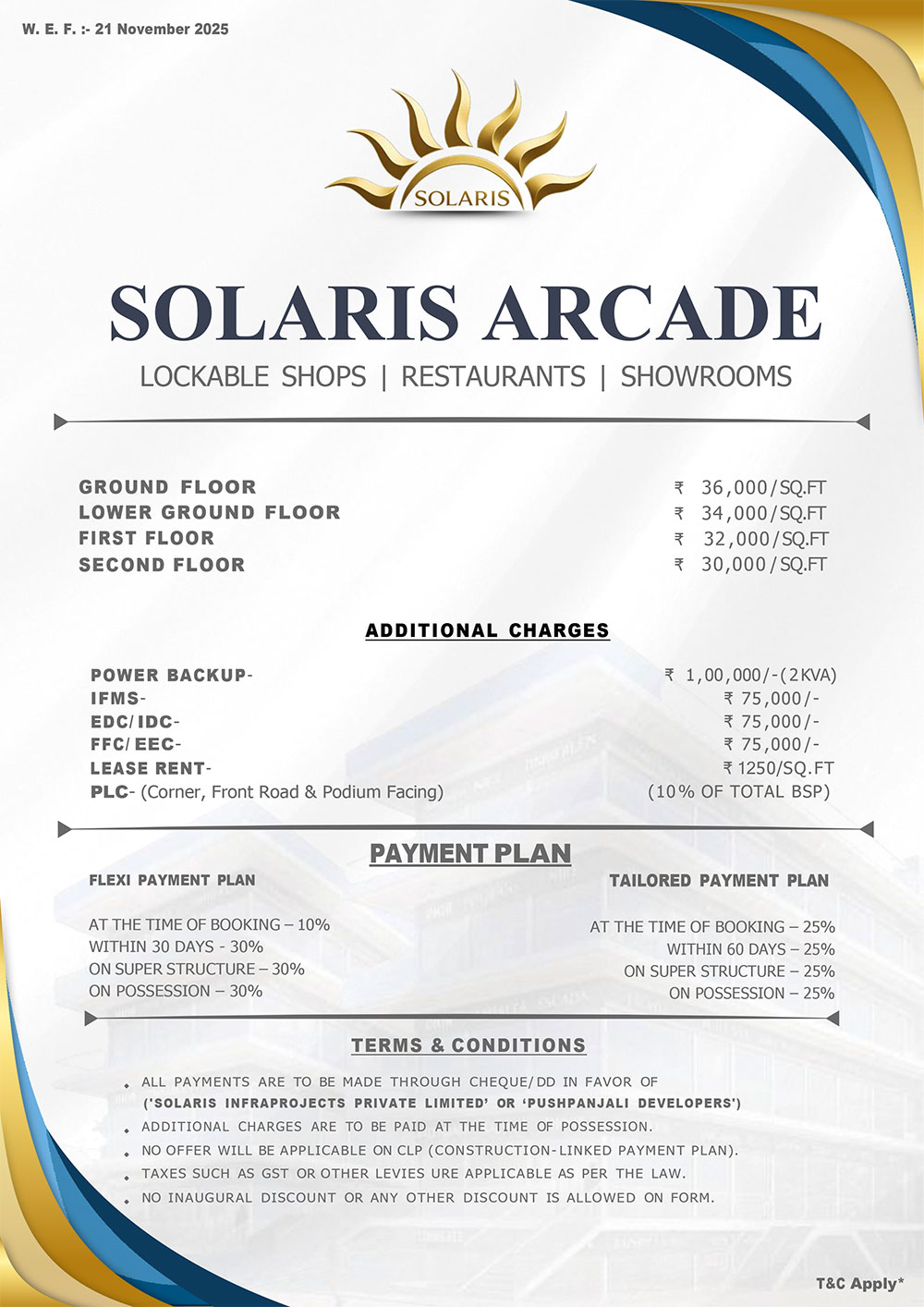 Solaris Arcade is a landmark high-street commercial project situated in the heart of Sector 1, Greater Noida West (Noida Extension). Designed to serve as a vibrant lifestyle and retail hub, it caters to an immediate catchment of over 2 lakh residents within a 2-km radius.